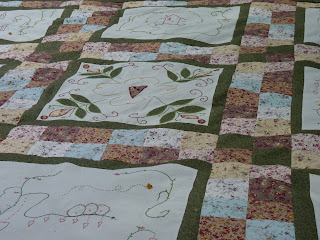 Még télen szerelmesedtem bele ebbe a takaróra. A neten találtam, neve Vintage garden és Natalie Lymer tervezte. Lassan haladtam a blokkok hímzésével, majd következett a rengeteg kocka kiszabása. A hímzett blokkokat beavattam varrás előtt, a mosástól eldeformálódtak, a zöld anyag varrás közben nem tartotta nagyon a méreteit, de elkészült a nagy mű - legalább is az előlapja - ezen a hétvégén. Megkínlódtam érte, de hát persze hátra van még a hátlapozás és a tűzés, ami eltart még egy ideig, de már most nagyon szeretem. Elég méretes példány 230x230-as, de kell is, hogy szépen beterítse a franciaágyat.